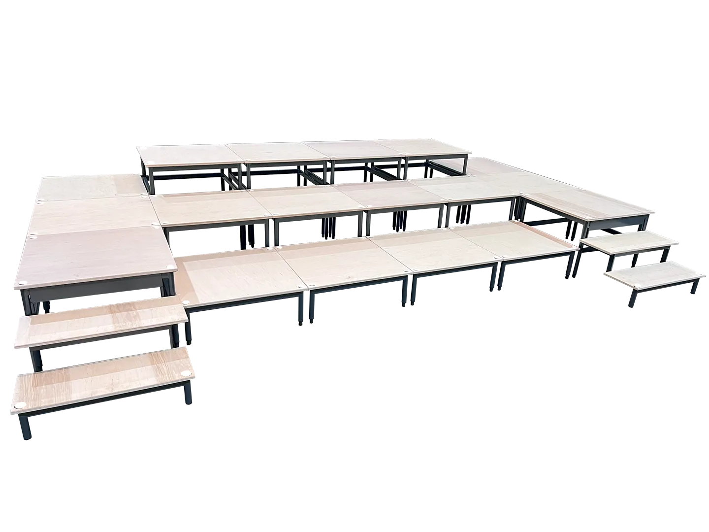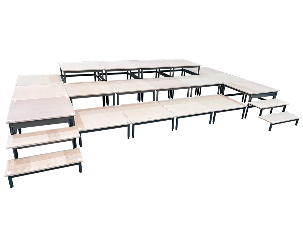 Nasze sceny sprawdzają się zarówno podczas kameralnych spotkań, jak i dużych wydarzeń — zapewniają szybki montaż, bezpieczeństwo i profesjonalny wygląd.